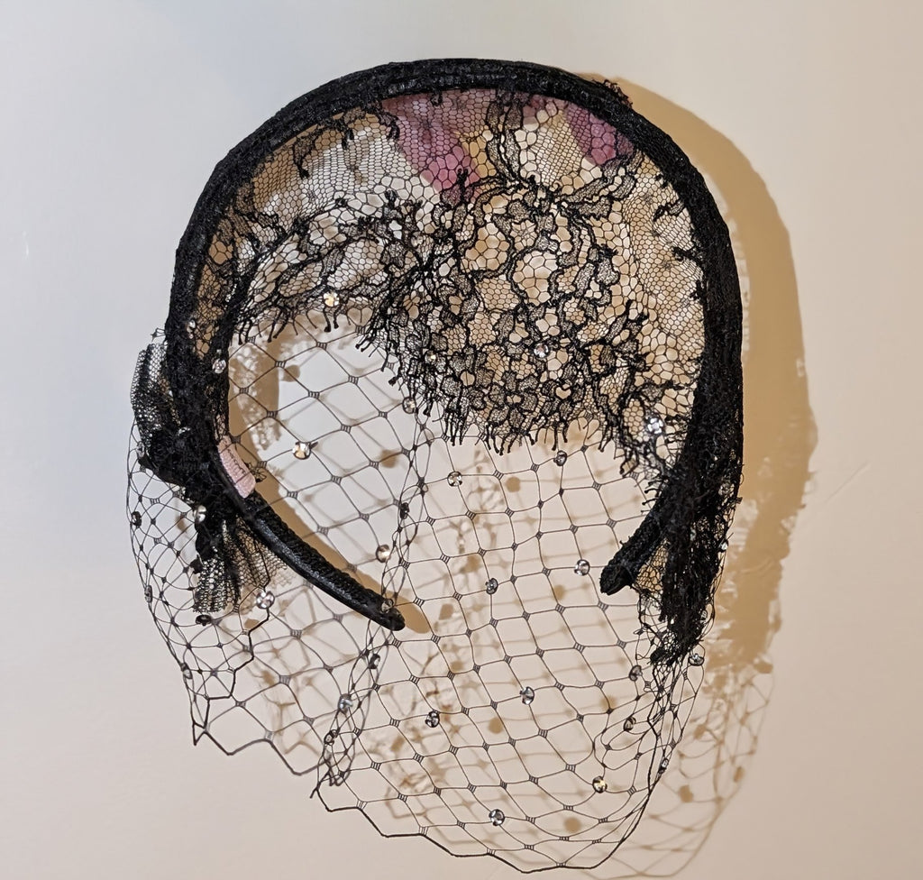 This Chantilly Lace Crystal Net headband birdcage veil features a delicate black lace design adorned with sparkling crystals. Elevate any outfit with this elegant and versatile veil accessory. Perfect for special occasions. This headband adds a timeless touch to your look.