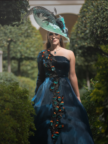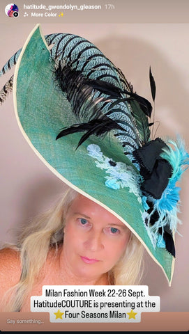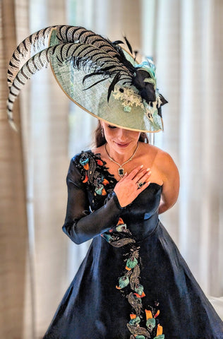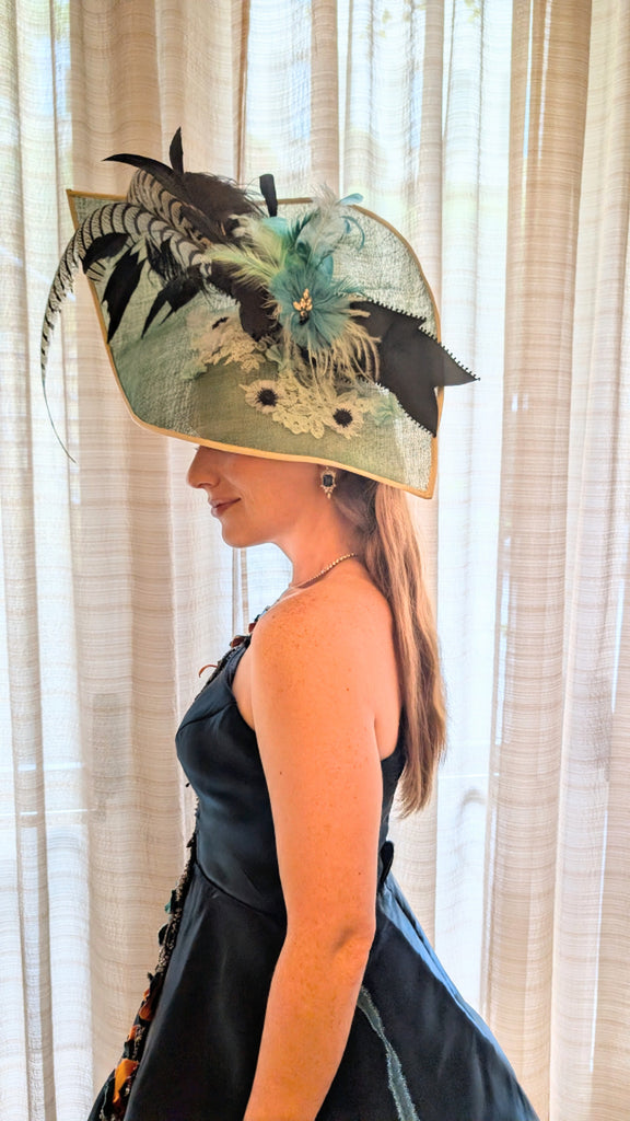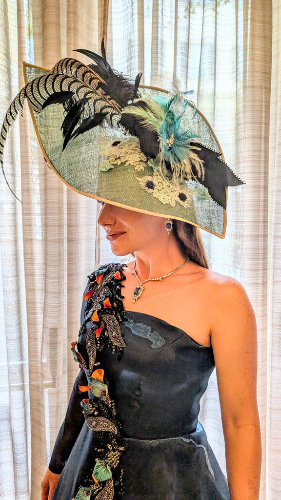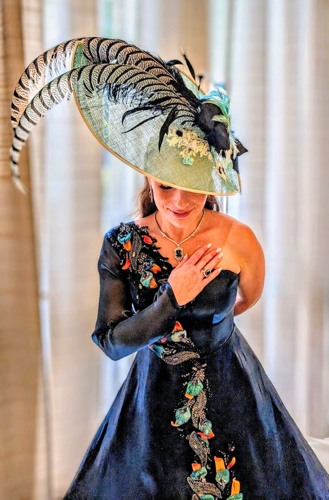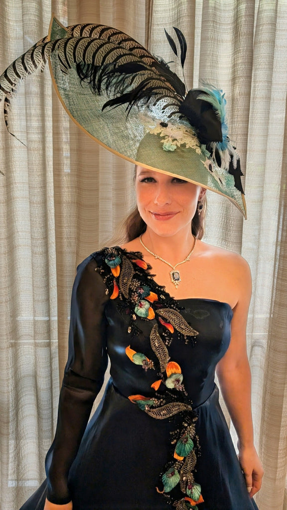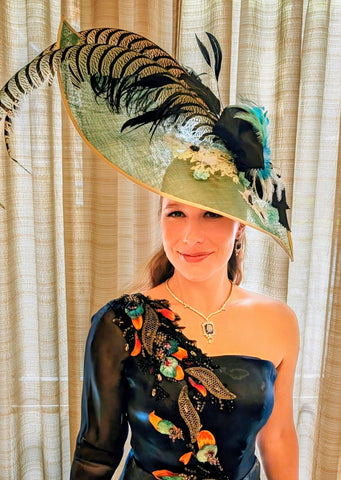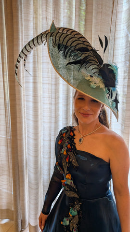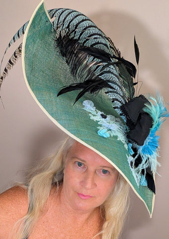 Experience the elegance of Royal Belgravia with this custom dyed jade green color sinamay straw dome shape hat. Adorned with 30" pheasant plumes and striped ostrich feather's all custom dyed feathers and glitter feathermake it a stand out hat at the Dubai/ Royal Ascot/Kentucky Derby Horse Races. A bejeweled crystal broach with black taffeta ribbon bow adds a touch of luxury. This hat exudes glamour and sophisticated style. A definite show stoper at the Races!