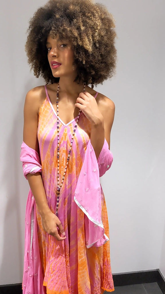 (Ships From Florida) This sundress features a unique handkerchief drape and shibori tye dye design. Perfect for warm weather, the flowy silhouette flatters all body types. Made with high-quality materials, this dress ensures both style and comfort. Elevate your wardrobe with this one-of-a-kind piece. Front & back Japanese shibori dye technique. 100% cotton voile. Velvet stretch straps. Available in 3 color ways. Hand dye in Rajasthan, An Indian traditional hand craftsmanship.
