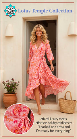 Embrace the essence of romance and bohemian allure with this exquisite wrap dress, artfully adorned in a harmonious blend of coral, pink, and white floral block print. Crafted from 100% cotton poplin, its bias-cut skirt cascades gracefully, while the tassel tie at the waist enhances the silhouette's feminine charm. The three-quarter sleeves provide a sense of effortless elegance, making this piece an enduring staple in the world of cottage core boho fashion.